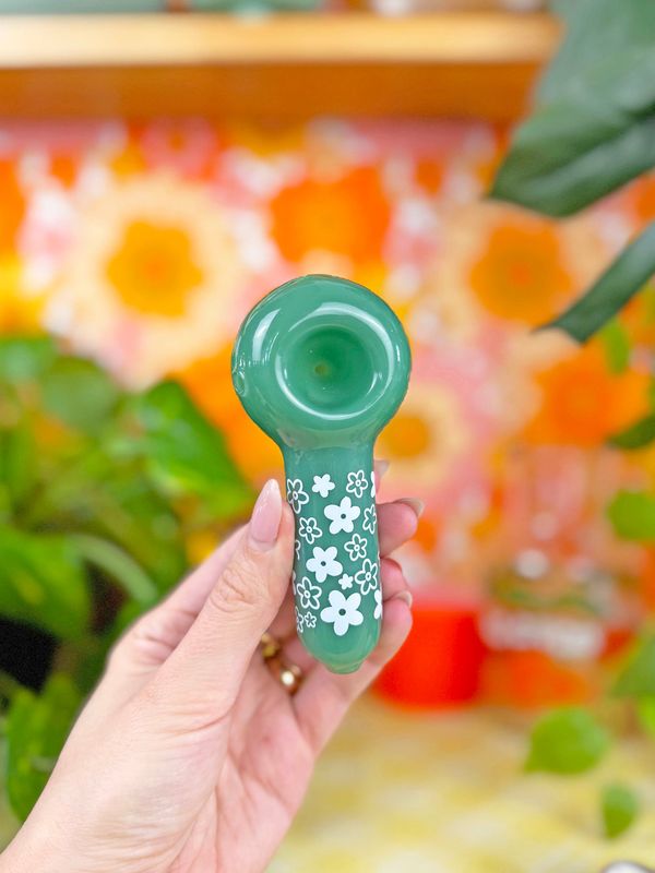 This beauty is made of gorgeous jade green glass and features our vintage blossom pattern! It has a flat bottom under the bowl to keep it from rolling away :) This is a traditional pipe, the bowl is on the end, the mouthpiece is at the bottom, and the carb is on the left-hand side.