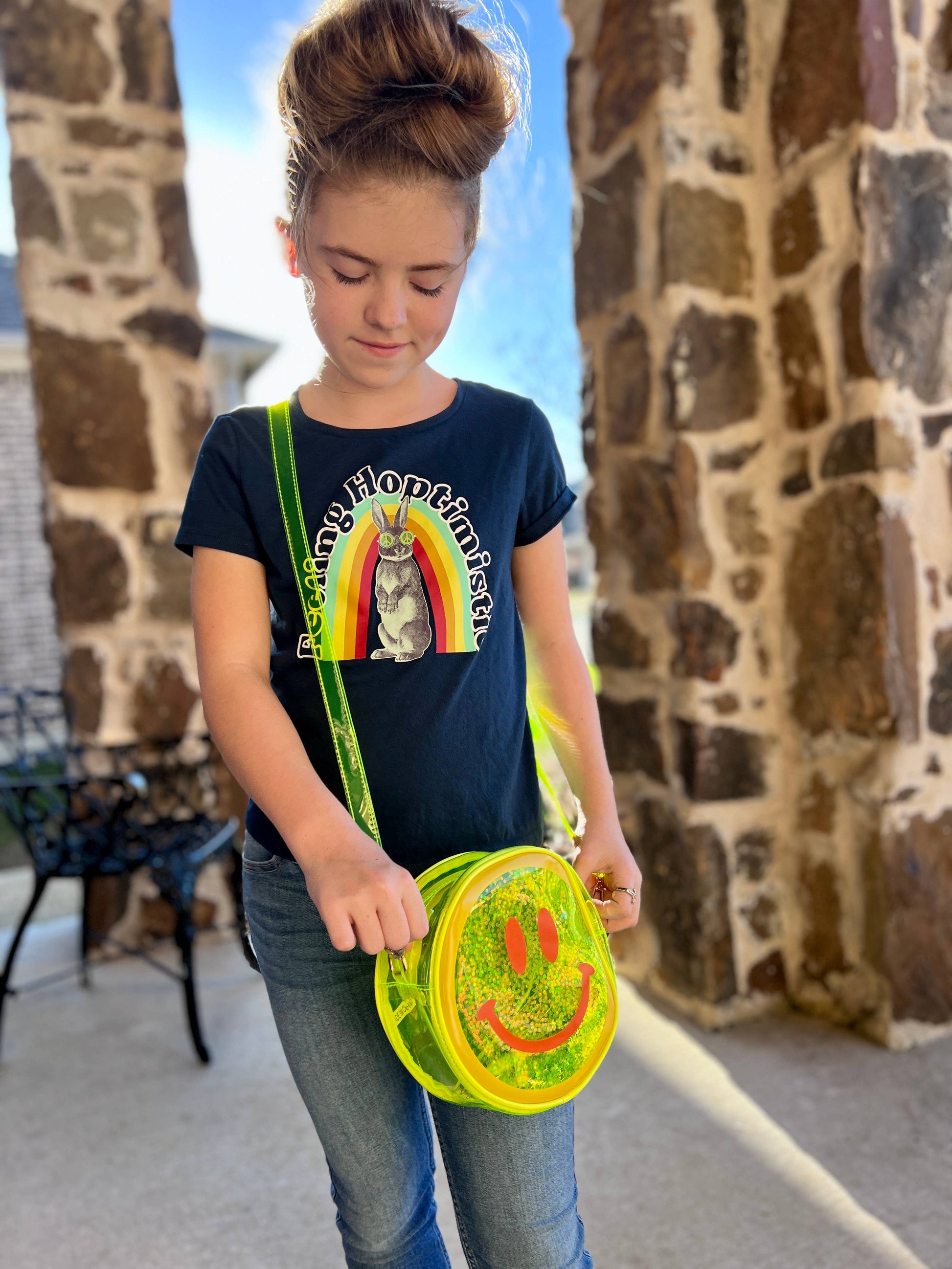 Clear neon yellow vinyl with smiley face design, filled with glitter!